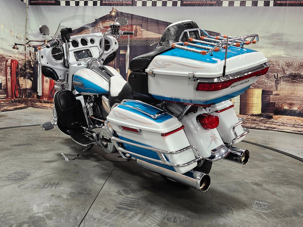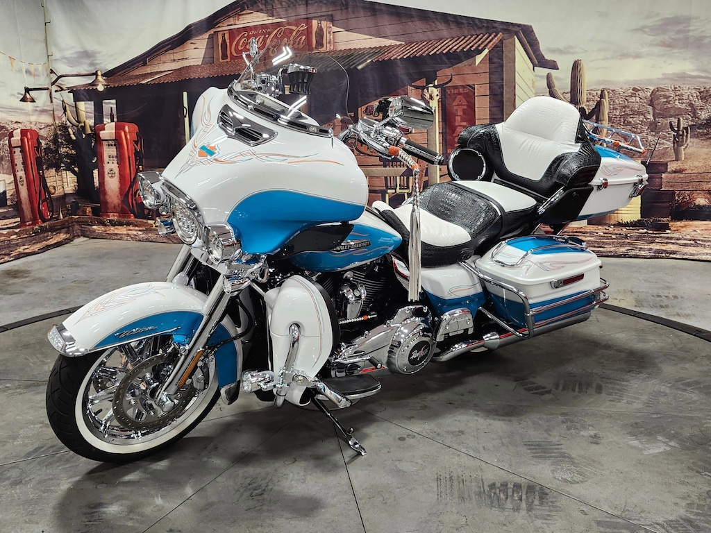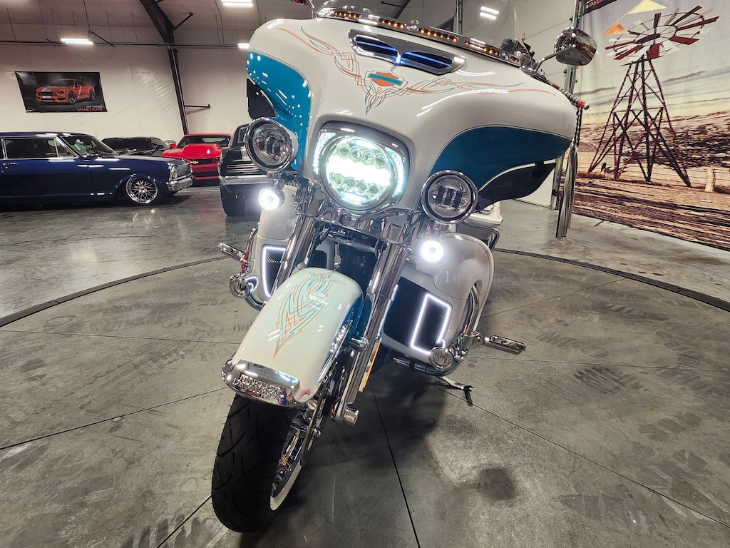 This 2017 Harley-Davidson Electra Glide Ultra Classic with 7192 miles is powered by a Twin-Cooled Milwaukee-Eight 114 (1868cc) V-Twin engine and a 6-speed transmission. A stage II upgrade was added. This Ultra Classic finished in Crushed Pearl/Frosted Teal with custom pinstriping is dressed to the nines. With a batwing fairing and split stream air vent for optimal air flow and reduced head buffeting. The two-up seat custom finished in white alligator upholstery with a deep bucket and narrow neck to provide more driver back support, and a wider passenger area with back and arm rests for more comfort and longer rides. Top of the line infotainment and sound The Boom! Box 6.5 GT system with GPS and a touchscreen, Dakota Digital gauges, cruise control, ABS brakes with chrome calipers, a Tour-Pak carrier, saddlebags with guards that open with one touch. LED lighting, fog lights, USB port for smartphone, chrome highway pegs, tie down brackets, Cup and phone holders mounted to the 12 ape bars. Also added Reinhard 4.5 exhaust, chrome wheels with white wall tires. Color changing LED lighting throughout with remote installed.