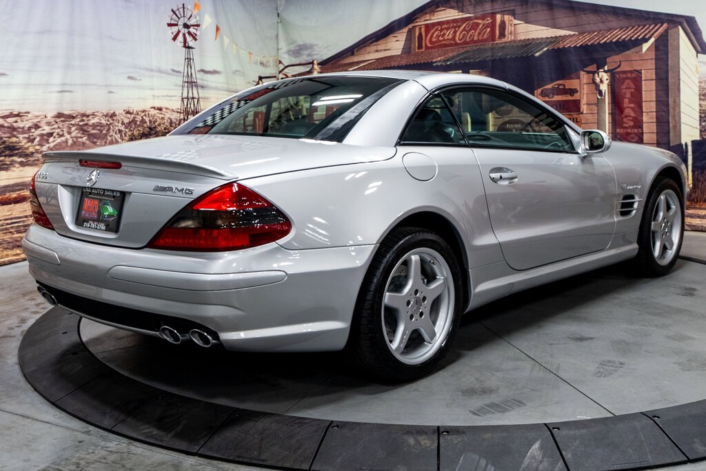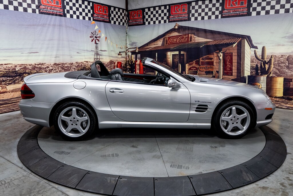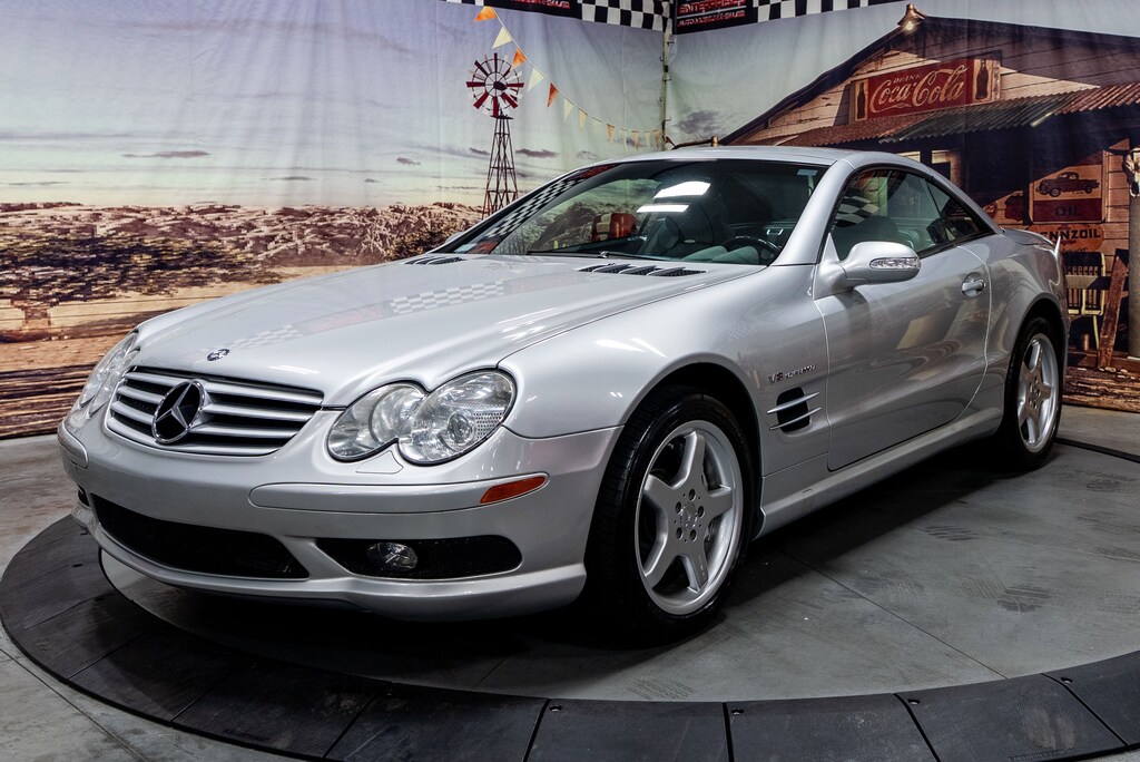 This 2003 Mercedes-Benz SL55 AMG is finished in Brilliant Silver Metallic (744) over Charcoal leather. Power is provided by a supercharged 5.4-liter V8 engine, paired with a five-speed automatic transmission, and the vehicle has 75,813 miles. The supercharged 5.4-liter M113 V8 was factory rated at 493 horsepower and 516 lb-ft of torque. Power is sent to the rear wheels through a five-speed automatic transmission with AMG SpeedShift programming and optional shifting via steering wheel-mounted buttons. The car is finished in Brilliant Silver Metallic (744) and features a body-color power-folding convertible hardtop. Additional details include bi-xenon headlights, fog lights, fender air vents, and AMG bodywork including a revised front spoiler, side skirts, and quad exhaust outlets. Silver-finished 18 AMG wheels are mounted with 255/40 front and 285/35 rear Michelin Pilot Sport. The car features Active Body Control suspension as well as an Electronic Stability Program, Automatic Slip Control, and an AMG High Performance Braking System with cross-drilled rotors. The heated and multi-contour AMG sport seats are upholstered in Charcoal leather, while wood veneer trim accents the center console and door panels. The multifunction leather-wrapped steering wheel frames a 200-mph speedometer, a 7k-rpm tachometer, and gauges for coolant temperature and fuel level. Amenities include dual-zone automatic climate control, cruise control, Keyless Go, a Bose sound system, and COMAND infotainment with navigation.